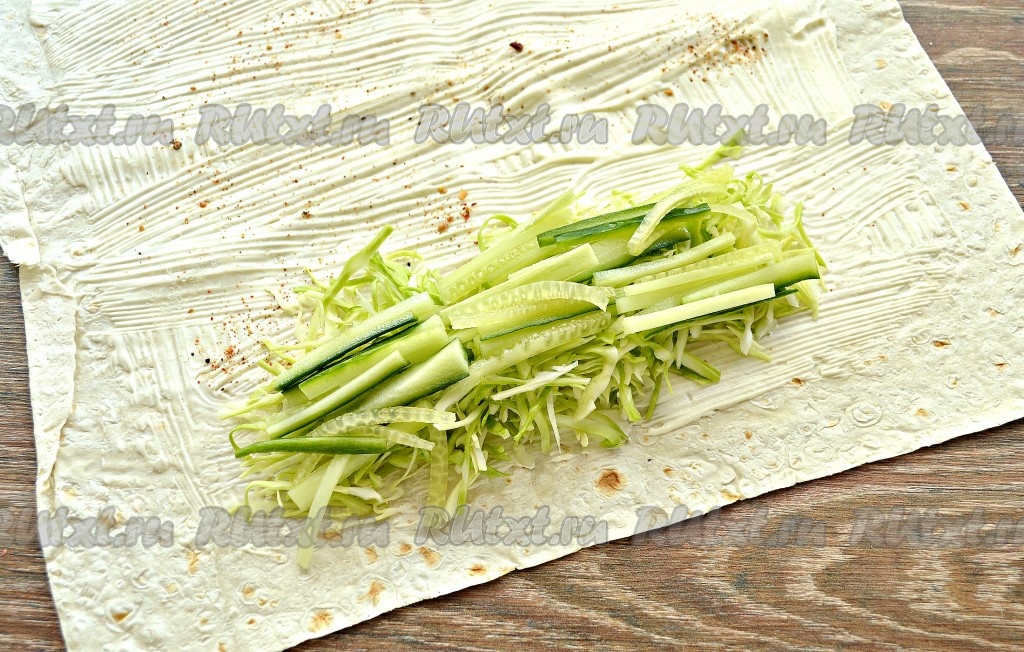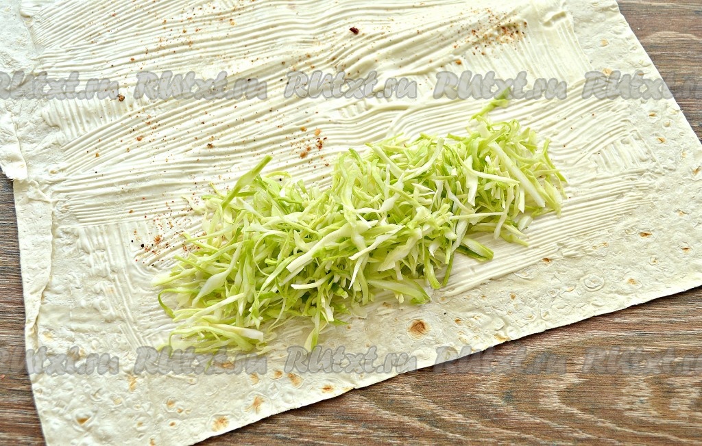 Пекинскую (или молодую белокочанную) капусту тонко нашинковать. Выложить нарезанную капусту на одну сторону лаваша в форме аккуратного четырехугольника.