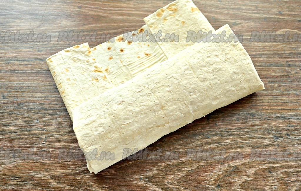 Приступаем к сворачиванию лаваша с начинкой, для этого сначала нужно подогнуть края лаваша по бокам, затем подвернуть край лаваша на начинку. Начиная с подвёрнутого края лаваша с начинкой, нужно свернуть лаваш в форме плоского рулета.