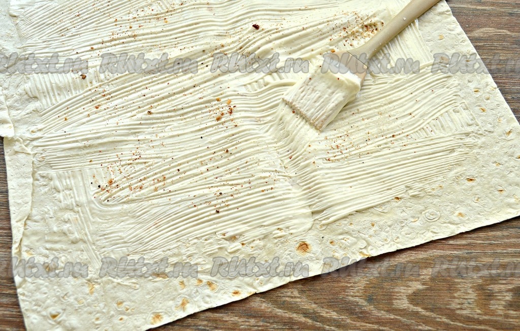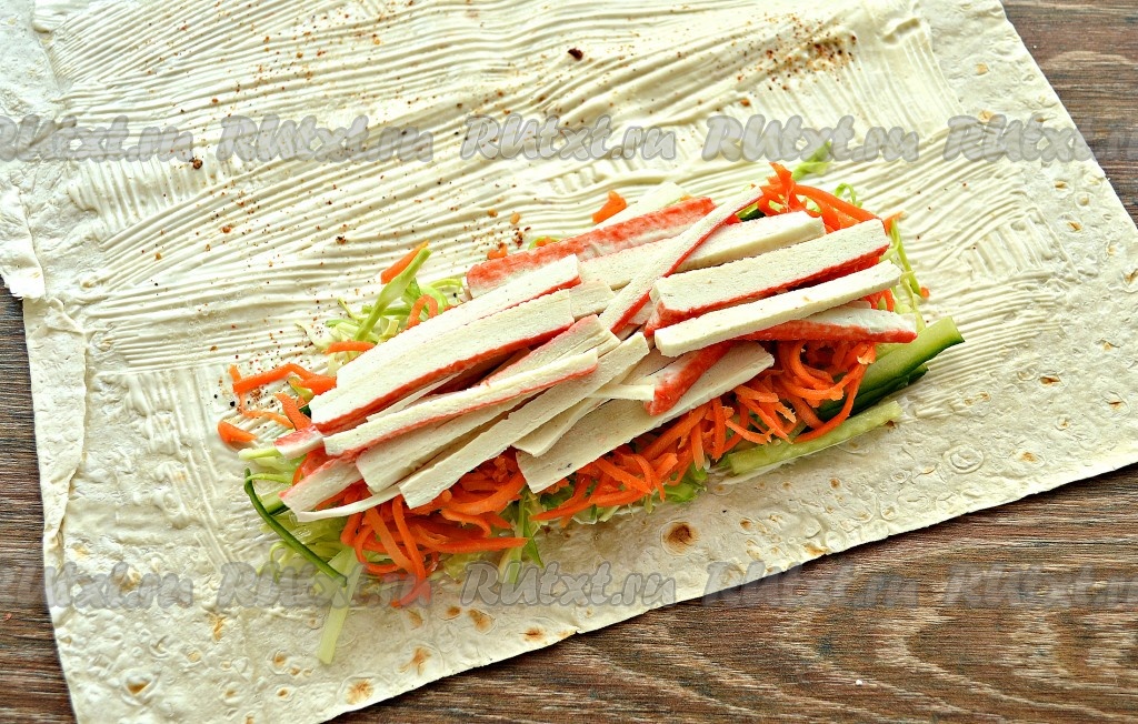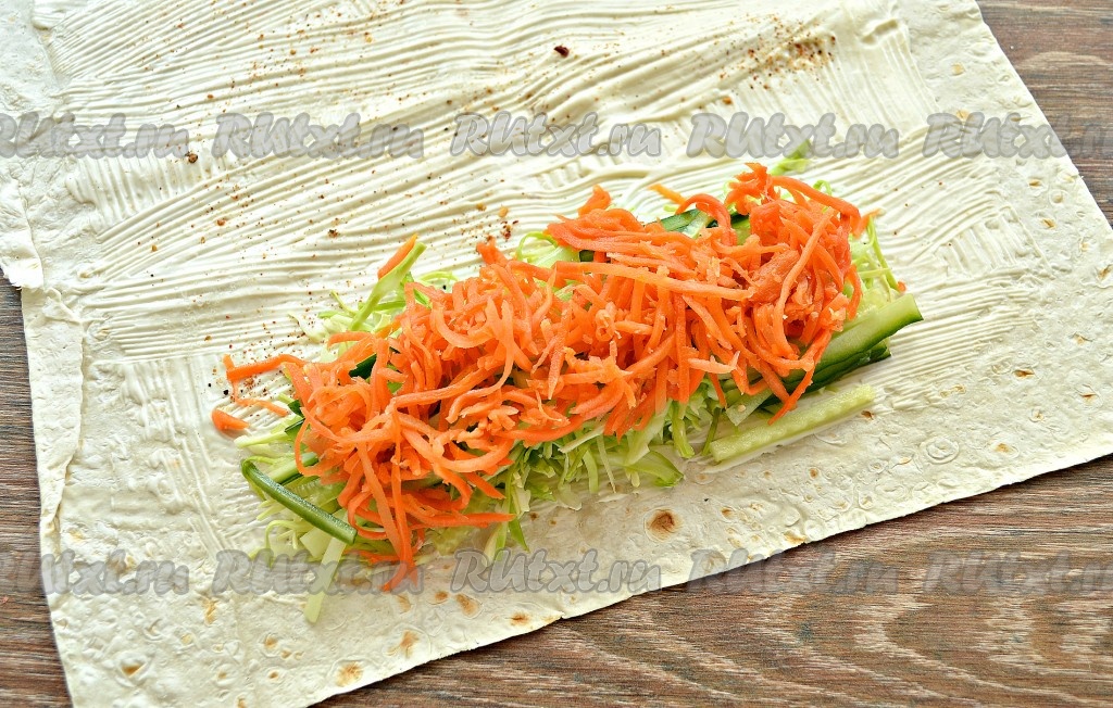Крабовые палочки достать заранее и разморозить при комнатной температуре, после этого можно приступать к приготовлению шаурмы. Разложить на столе свежий тонкий лаваш, смазать его поверхность майонезом, отступая от краёв, примерно, по 2 см. Попробуйте корейскую морковку, чтобы определиться с количеством в ней специй, затем, исходя из вкуса моркови, нужно по вкусу присыпать лаваш солью и смесью молотых перцев.