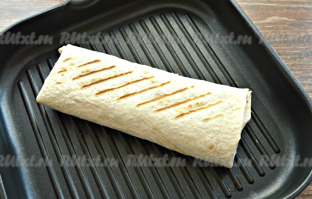 Хорошо разогреть сухую сковороду (я обжаривала шаурму на сковороде гриль). Сковороду смазывать маслом не нужно, поверхность должна быть сухой, но хорошо разогретой на среднем огне. Обжарить шаурму с крабовыми палочками на среднем огне с двух сторон до румяности (примерно, по 1 минуте с каждой стороны).