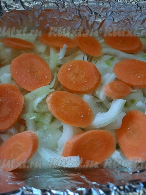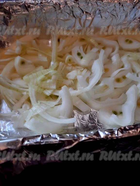 Жаропрочную форму застелить фольгой и поверх фольги выложить нарезанный репчатый лук.