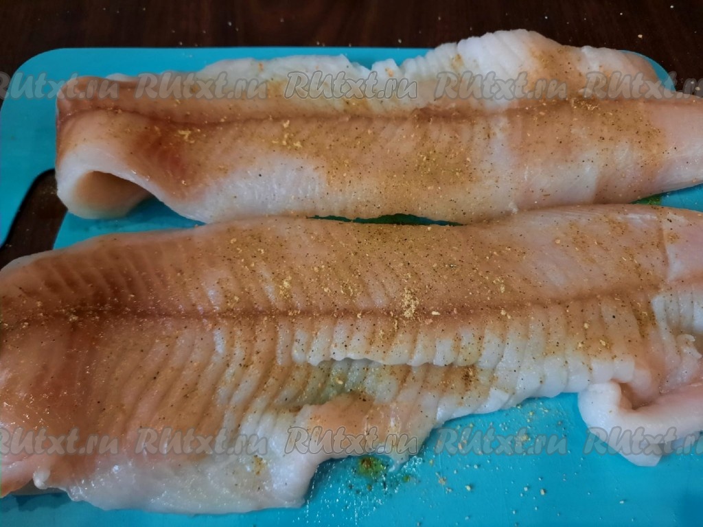 Можно купить в магазине филе щуки уже отделённое от костей, а можно взять рыбку целиком и разделать на филе. Если филе заморожено, разморозьте его полностью. Подготовленное филе посолить, добавить специи по вкусу (я использовала универсальную приправу для рыбы).