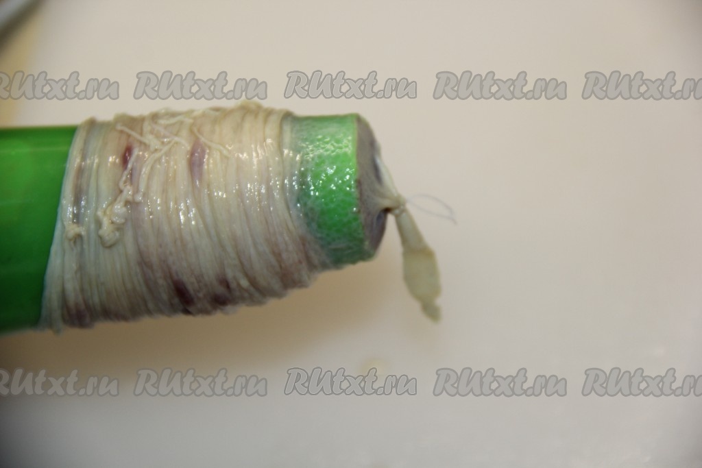 На конус для мясорубки для формирования колбас натянуть кишку. Кончик завязать ниткой (как на фото).