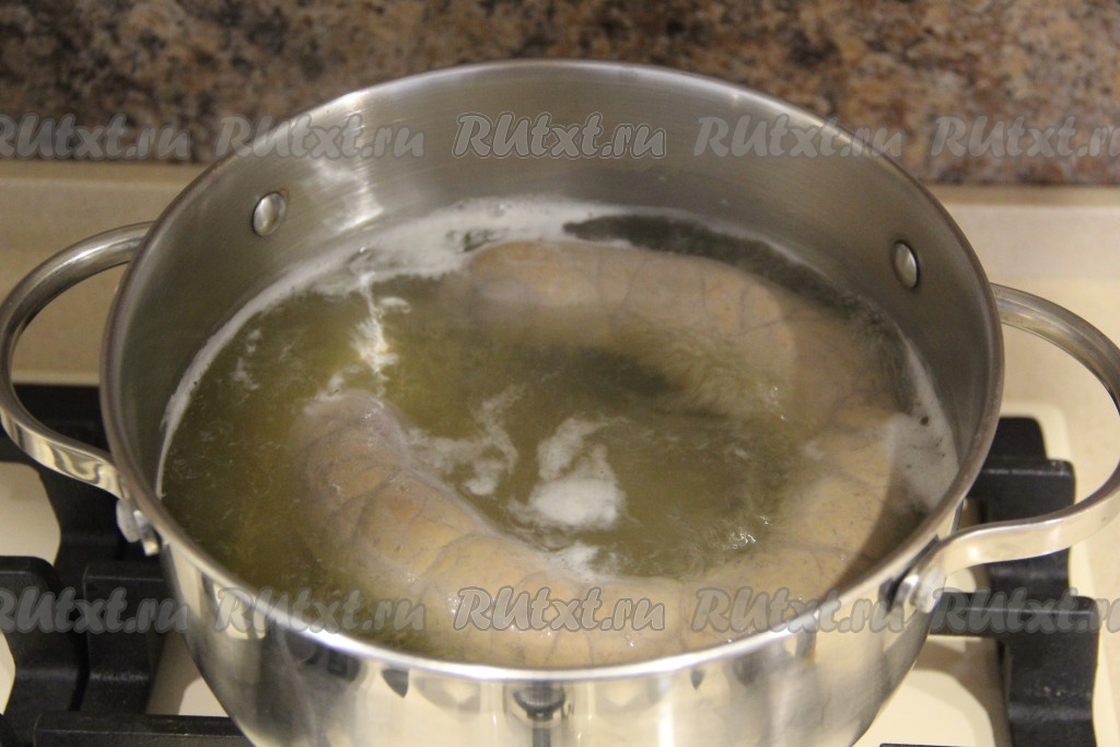 По прошествии минимум 6 часов достать колбасу из холодильника, наколоть кишку зубочисткой (примерно, 20 проколов на длинную колбаску). Затем выложить печёночную колбаску в кастрюлю, залить холодной водой, поставить на огонь и варить с момента закипания на медленном огне, примерно, 30 минут.