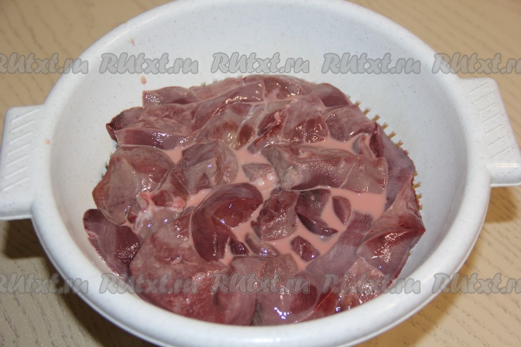 Выложить печень в миску и залить молоком, оставить на 1 час.
