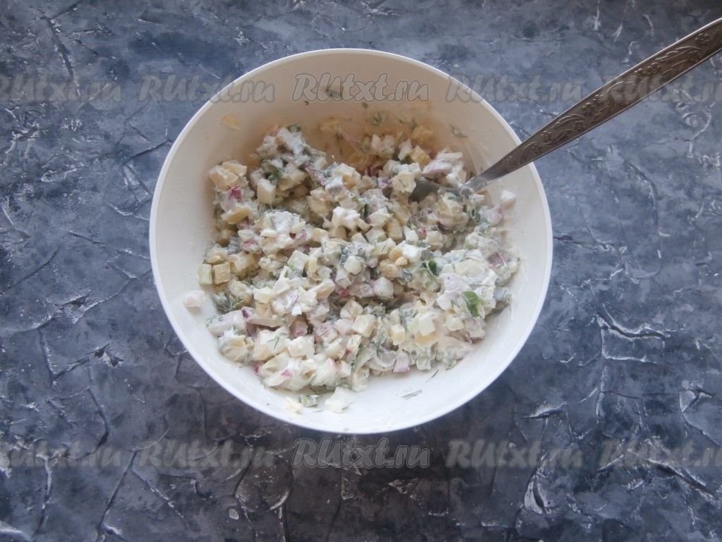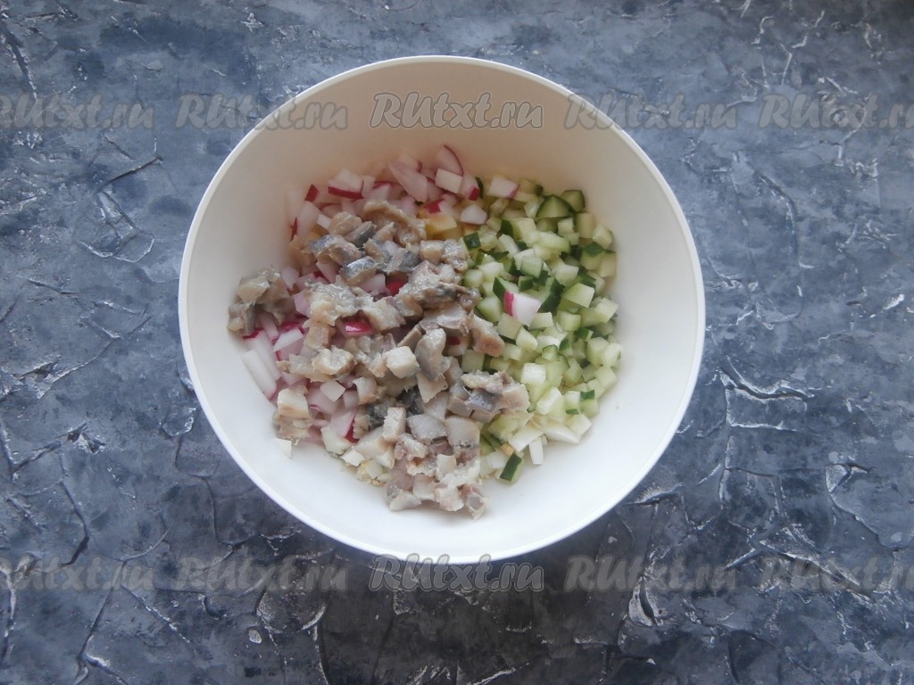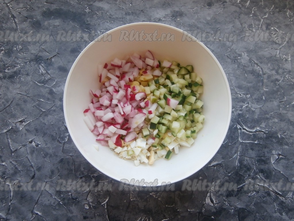 Сюда же выложить редис и свежий огурец, нарезанные небольшими кубиками.