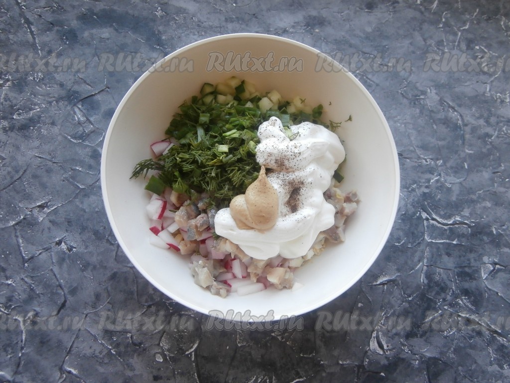 Сюда же добавить измельчённую зелень лука и укропа, сметану, горчицу и чёрный молотый перец.