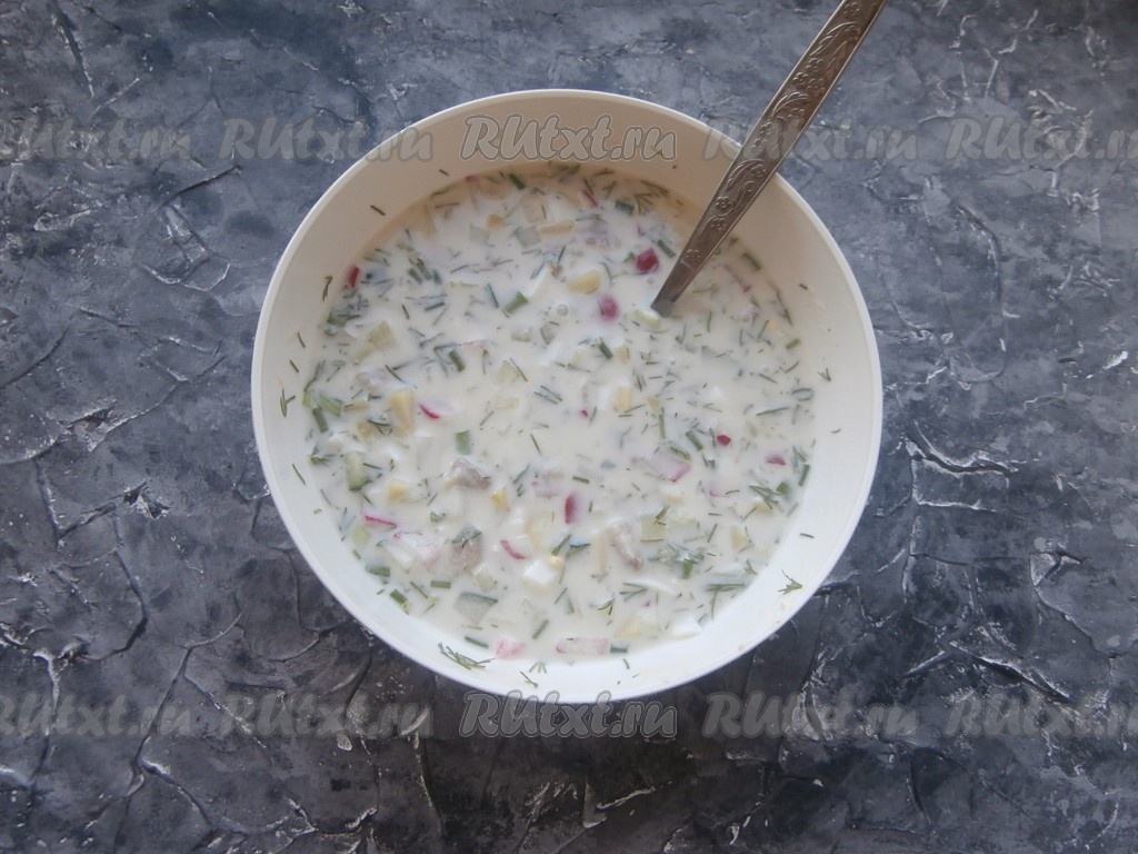Тщательно окрошку с селёдкой перемешать, посолить, добавить сахар и всыпать лимонную кислоту по вкусу. Ещё раз окрошку перемешать и охладить в холодильнике в течение 2-3 часов.