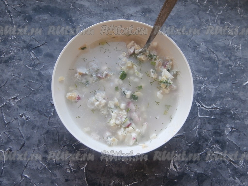 Необычную, но вкусную окрошку, приготовленную с селёдкой, разлить по тарелкам и подать к столу. По моему мнению, это блюдо лучше всего готовить на один раз.