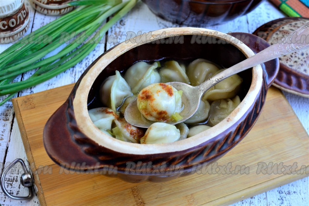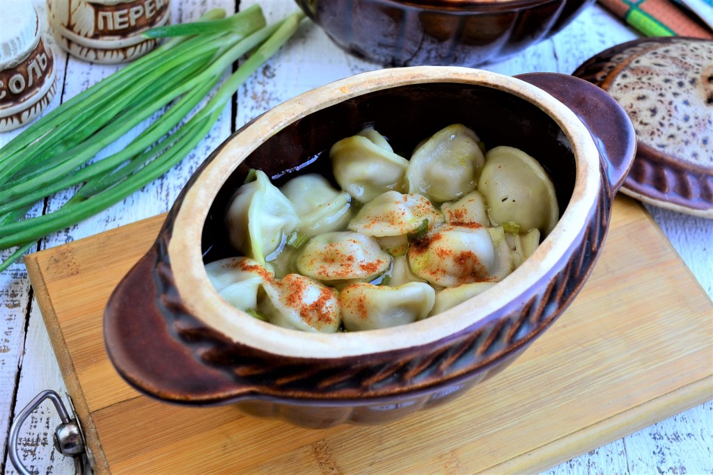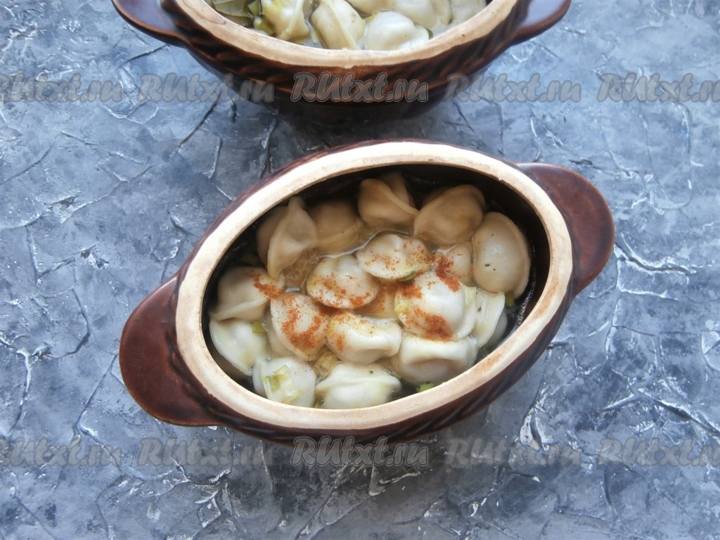 Накрыть горшочки крышками и отправить их в разогретую до 180 градусов духовку на 25 минут. Полностью готовые пельмени перемешать с бульоном и посыпать красным молотым перцем.