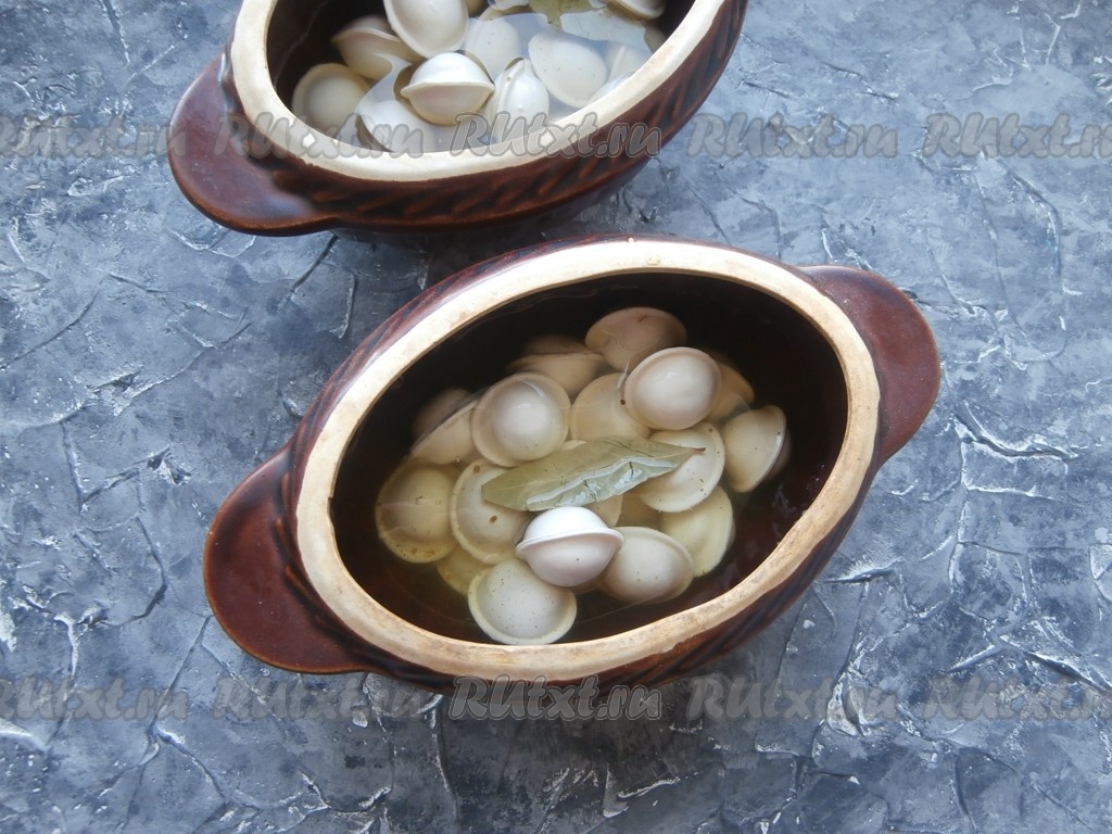 Влить холодную воду (или охлаждённый бульон), которая должна немного покрывать пельмени, добавить по лавровому листу в каждый горшочек.