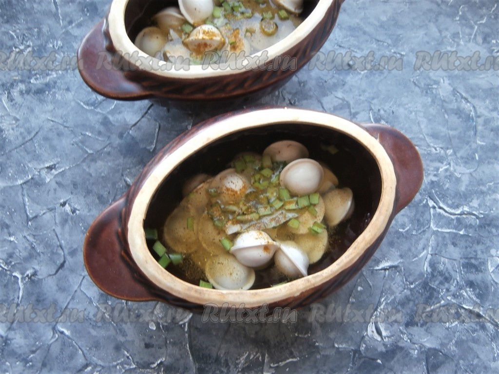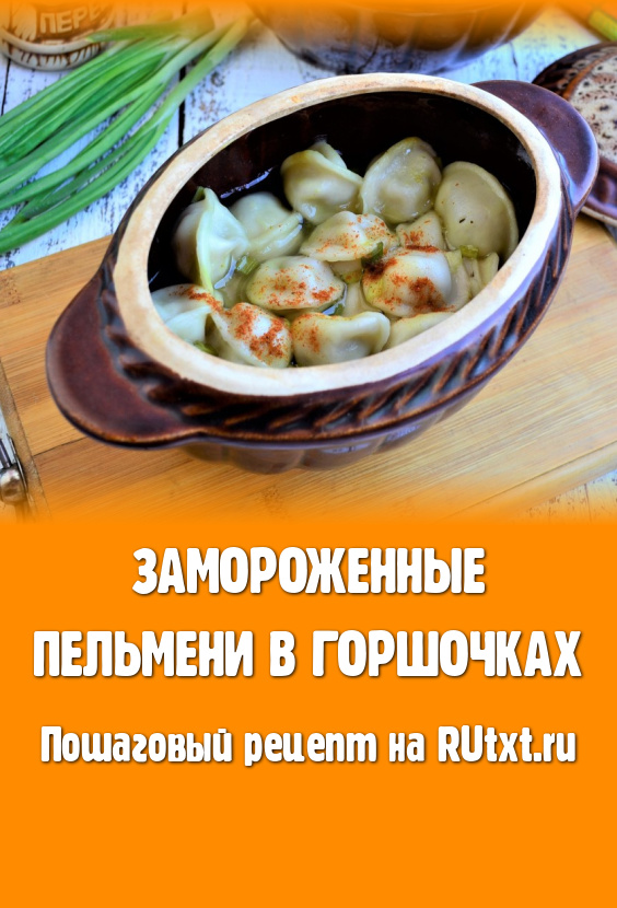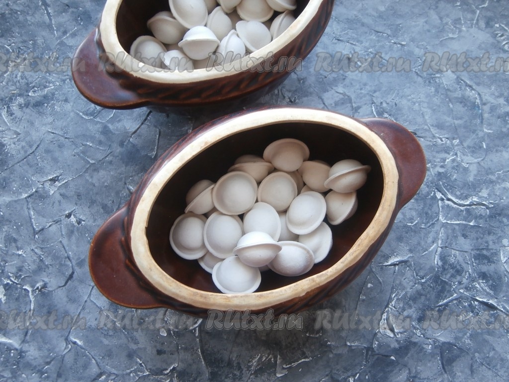 Замороженные пельмени разложить поровну по горшочкам (у меня горшочки объёмом 500 мл).