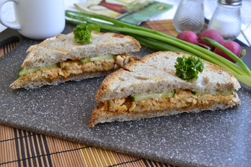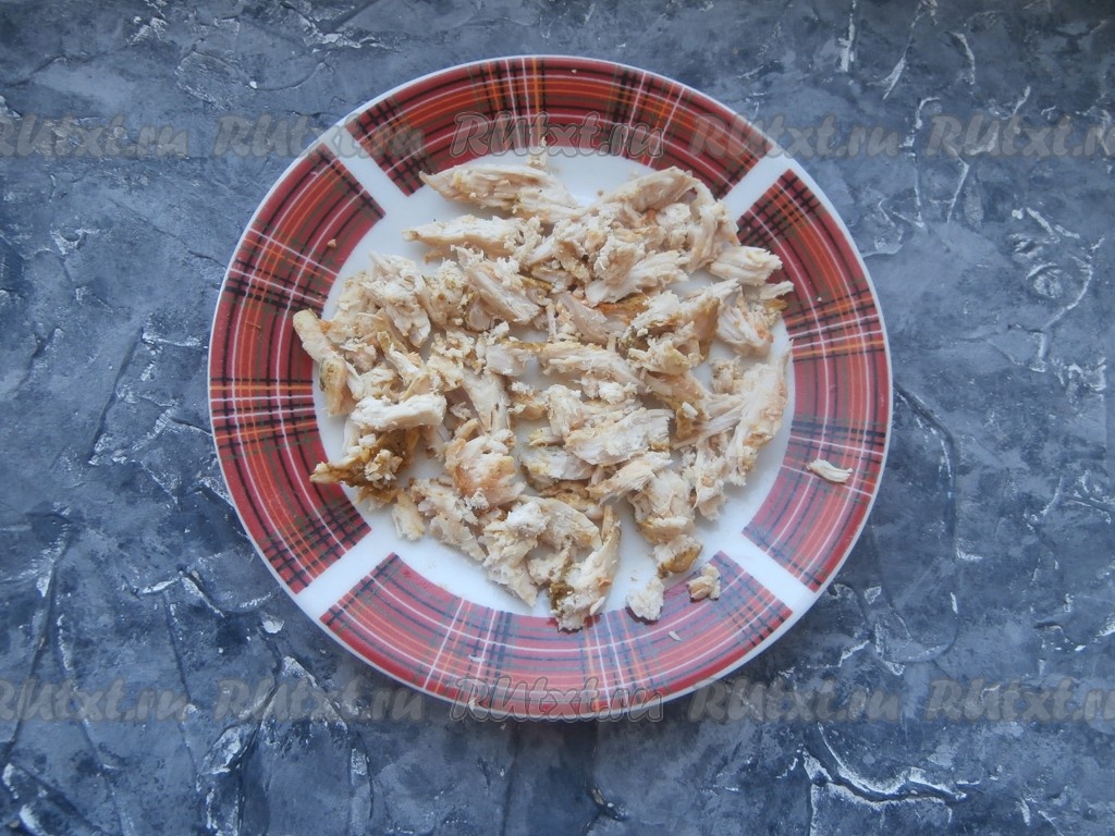 Куриное мясо для сэндвича можно взять запечённое или отварное. Я запекала небольшой кусочек куриного мяса в разогретой духовке в течение 25-30 минут при температуре 180 градусов. Готовое мясо нарезать (или порвать) на длинные кусочки.