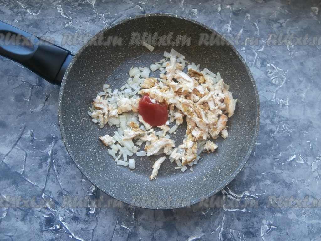 Сюда же выложить томатный соус (или кетчуп).