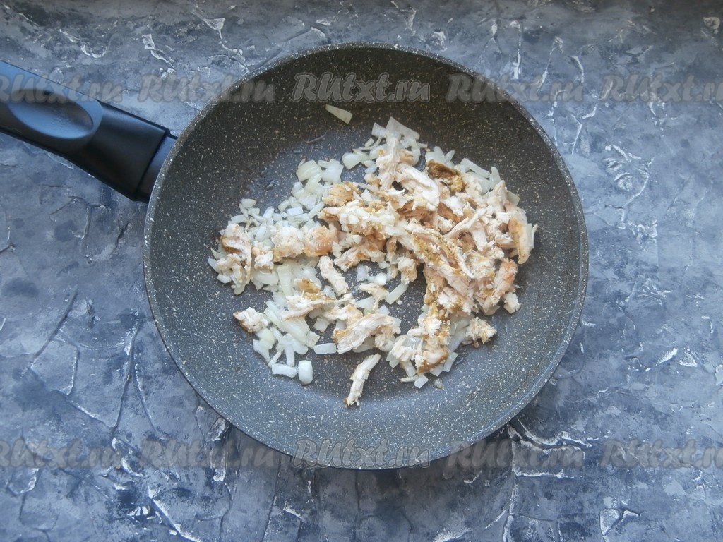 Обжарить лук, пару раз перемешивая, до прозрачности на среднем огне (в течение 3-5 минут), затем добавить куриное мясо.
