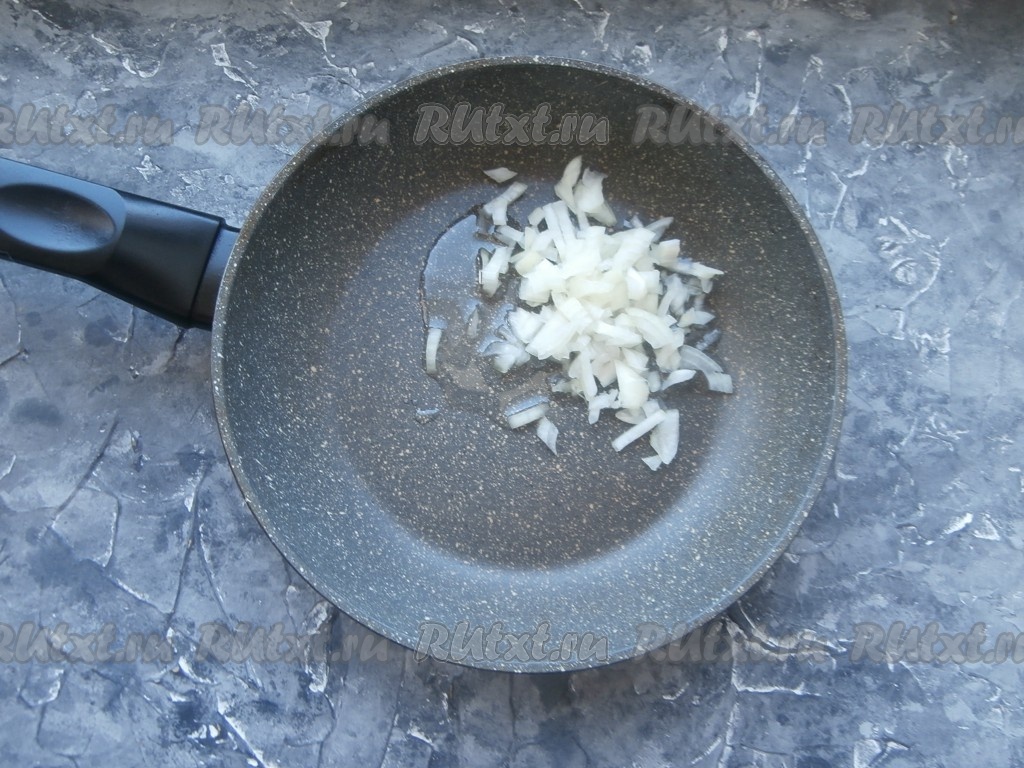 В сковороде разогреть растительное масло, выложить очищенную и мелко нарезанную небольшую луковицу.