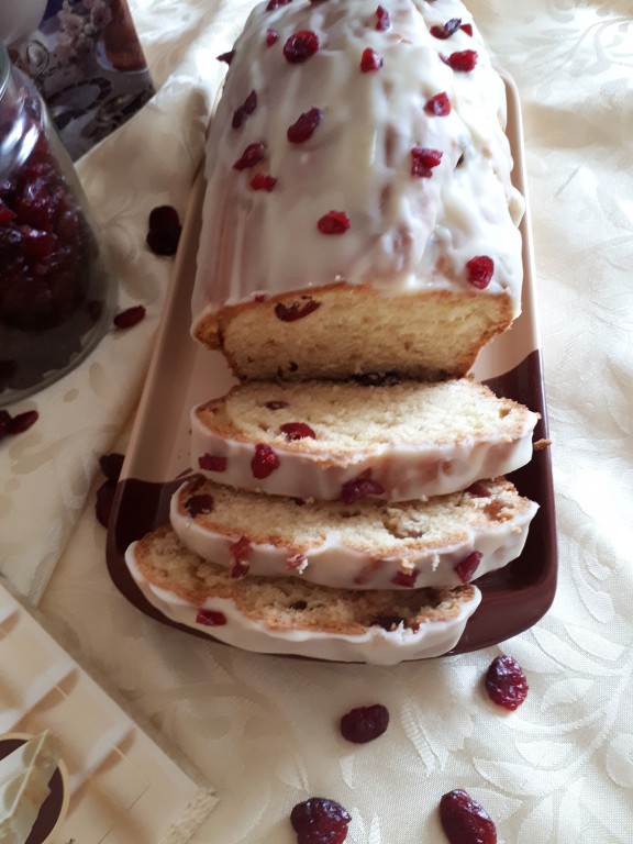 После застывания глазури нежный, сочный кекс с белым шоколадом и вяленой клюквой нарезать на части и подать к чаю или кофе.