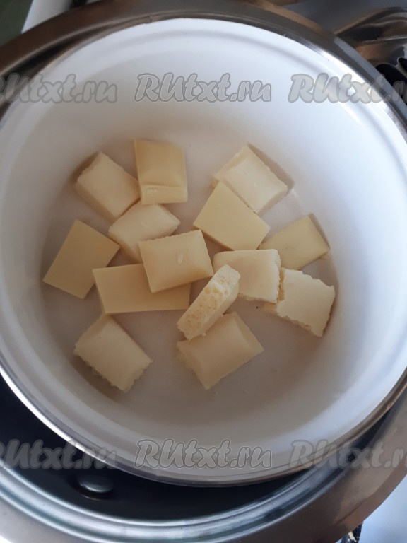Все продукты для приготовления кекса должны быть комнатной температуры. Белый шоколад растопить на водяной бане, затем остудить до комнатной температуры.