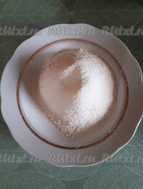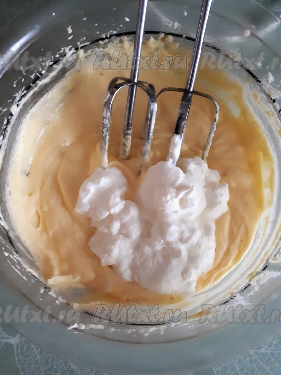 Муку просеять с разрыхлителем, добавить в тесто.