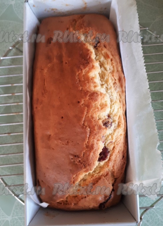 Поместить форму с тестом в духовку, нагретую до 180 градусов. Печь кекс с белым шоколадом и вяленой клюквой до готовности (минут 40-45). Для того чтобы проверить готовность, нужно проколоть кекс сухой деревянной шпажкой, если после прокола выпечки на шпажке не будет следов теста, значит кекс готов. Испечённый ароматный кекс вынуть из духовки, достать из формы и остудить на решётке.