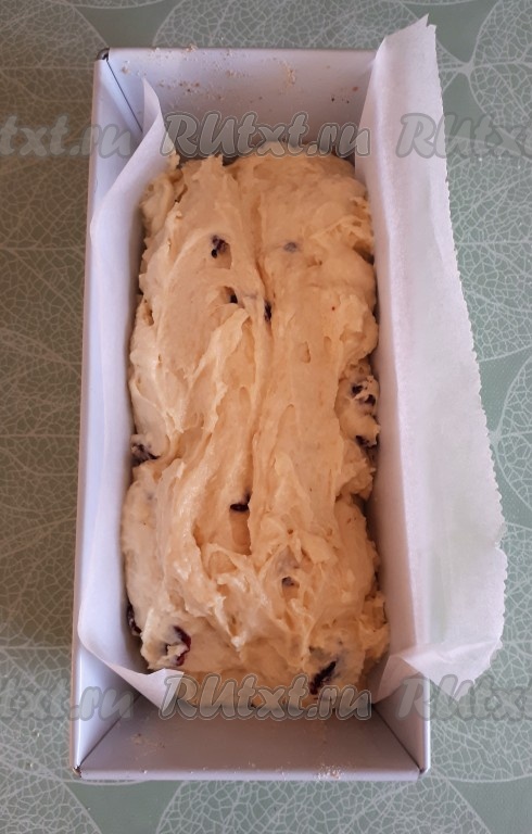 Форму для выпечки кекса застелить пергаментной бумагой (или просто смазать маслом) и припорошить мукой. Тесто выложить в форму.