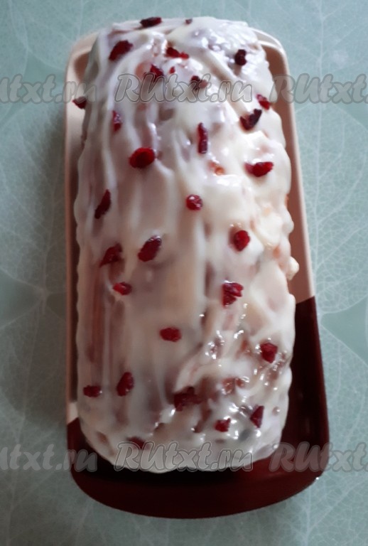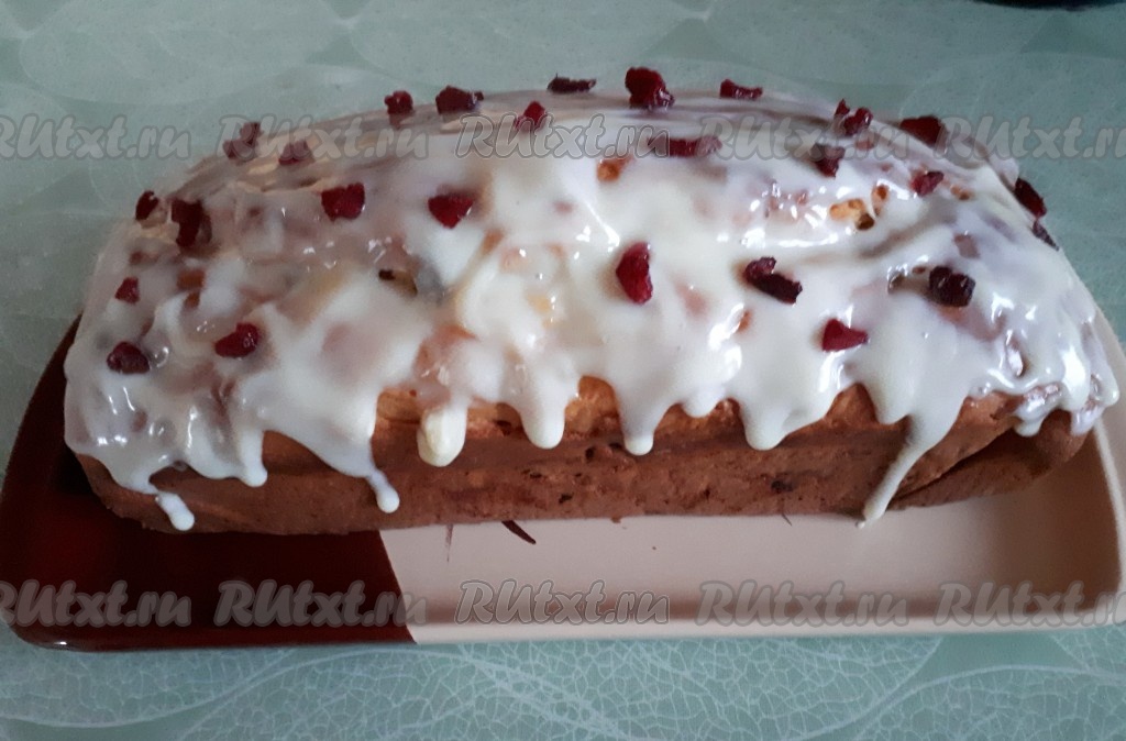Покрыть остывший кекс глазурью. Можно украсить кусочками вяленой клюквы.