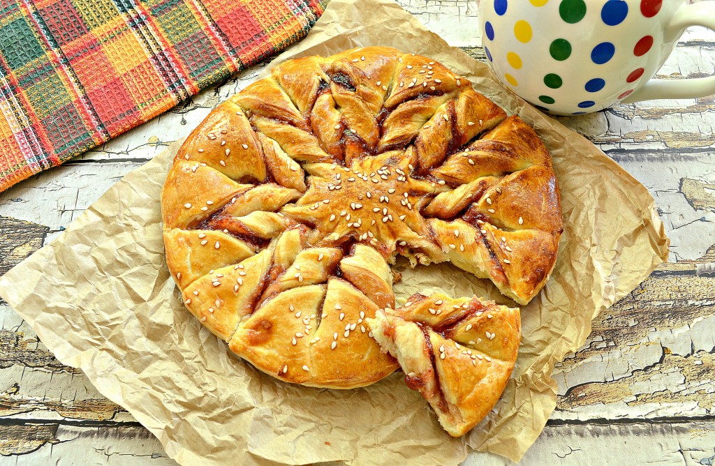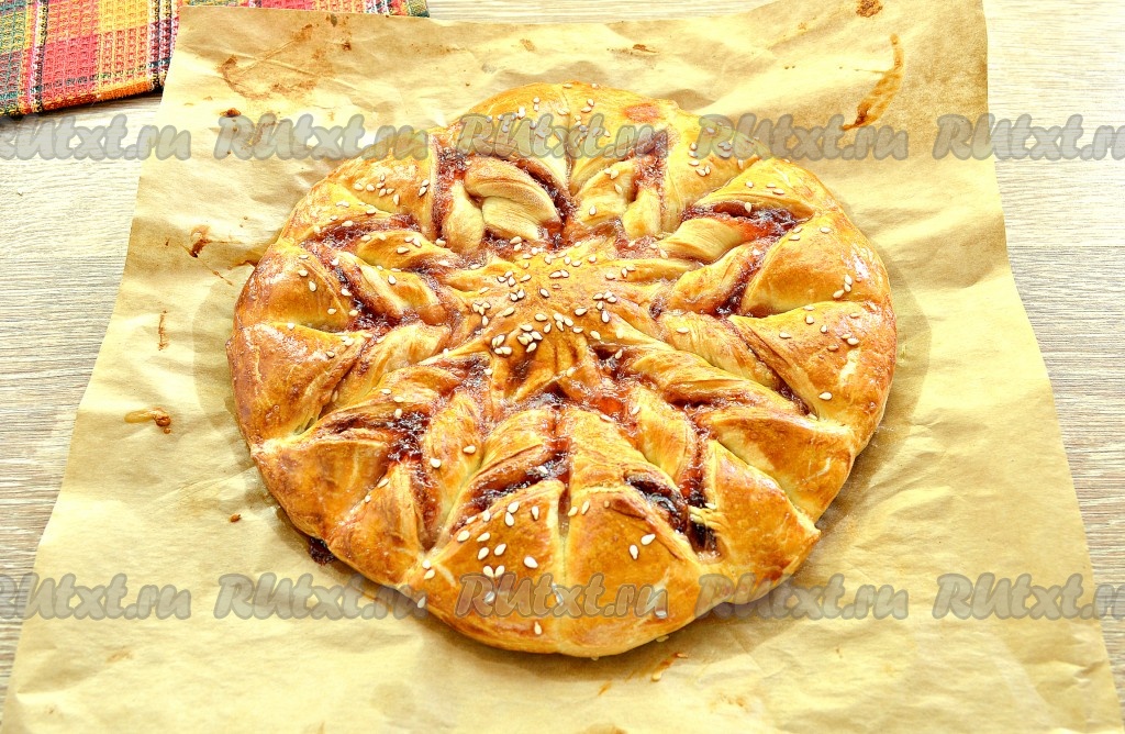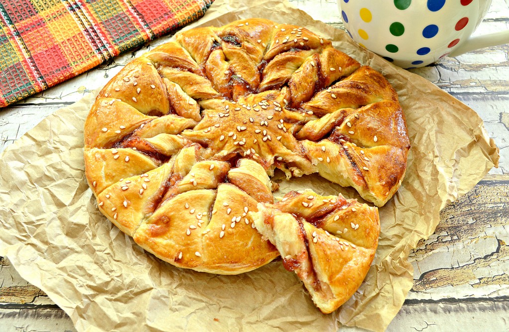 Пирог, приготовленный из слоёного дрожжевого теста с джемом, получился и вкусным, и красивым! Его не нужно нарезать, ведь лепестки прекрасно отделяются друг от друга.