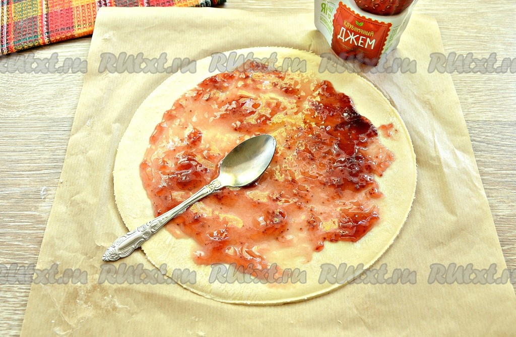Смазать вырезанный круг джемом, оставляя края чистыми. Я взяла клубничный джем, вы можете использовать свой любимый джем или тот, который есть в холодильнике на момент готовки.