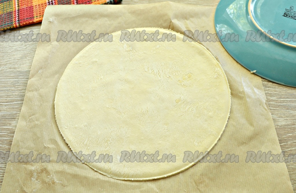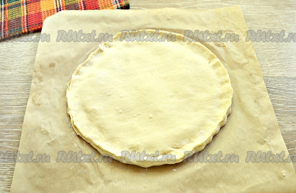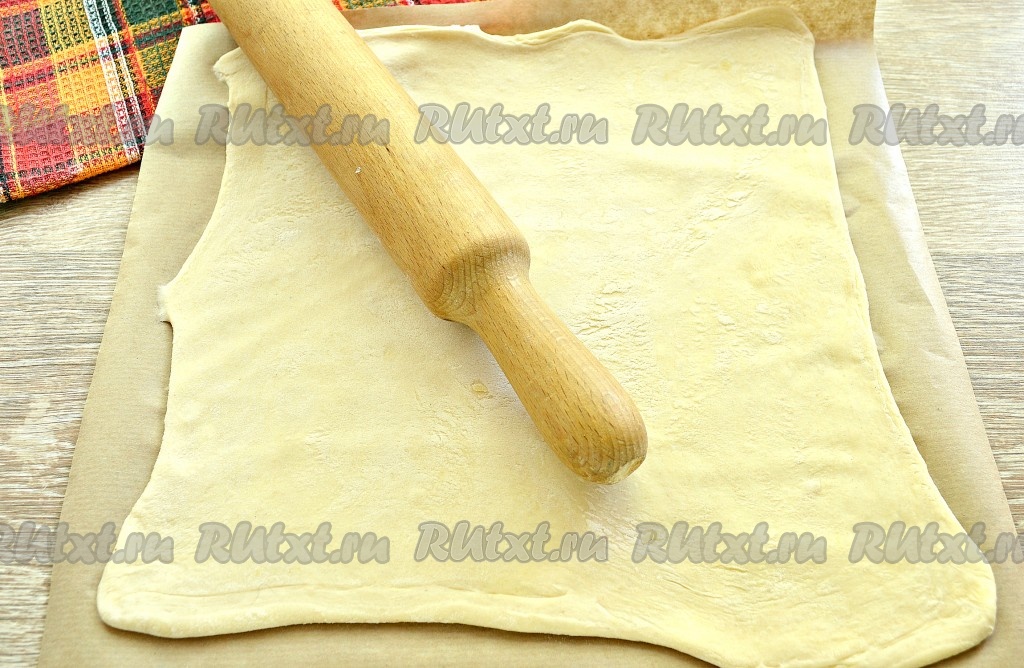 Поверхность стола присыпать мукой. Одну часть слоёного теста раскатать в пласт потоньше. Раскатанное тесто сразу выложить на кулинарный пергамент.