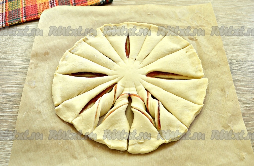 В центр основы пирога поставить рюмку. И, начиная от рюмки, сделать 16 надрезов, разделив пирог на сектора, как лепестки у цветка. Мне удобнее делать надрезы пиццерезкой, можно сделать и ножом.