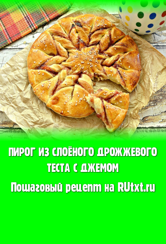 Готовое слоёное тесто, которое можно приобрести в продовольственном магазине, является отличным полуфабрикатом для домашней выпечки. Предлагаю приготовить вкусный пирог с джемом из слоёного дрожжевого теста. Джем можно взять как покупной, так и домашний из ягод или фруктов. Слоёный пирог с джемом будем формировать в виде цветка с лепестками, он получается превосходным по внешнему виду, отлично делится на отдельные кусочки и имеет замечательный вкус. Такой пирог - прекрасное дополнение к чашечке чая или кофе!