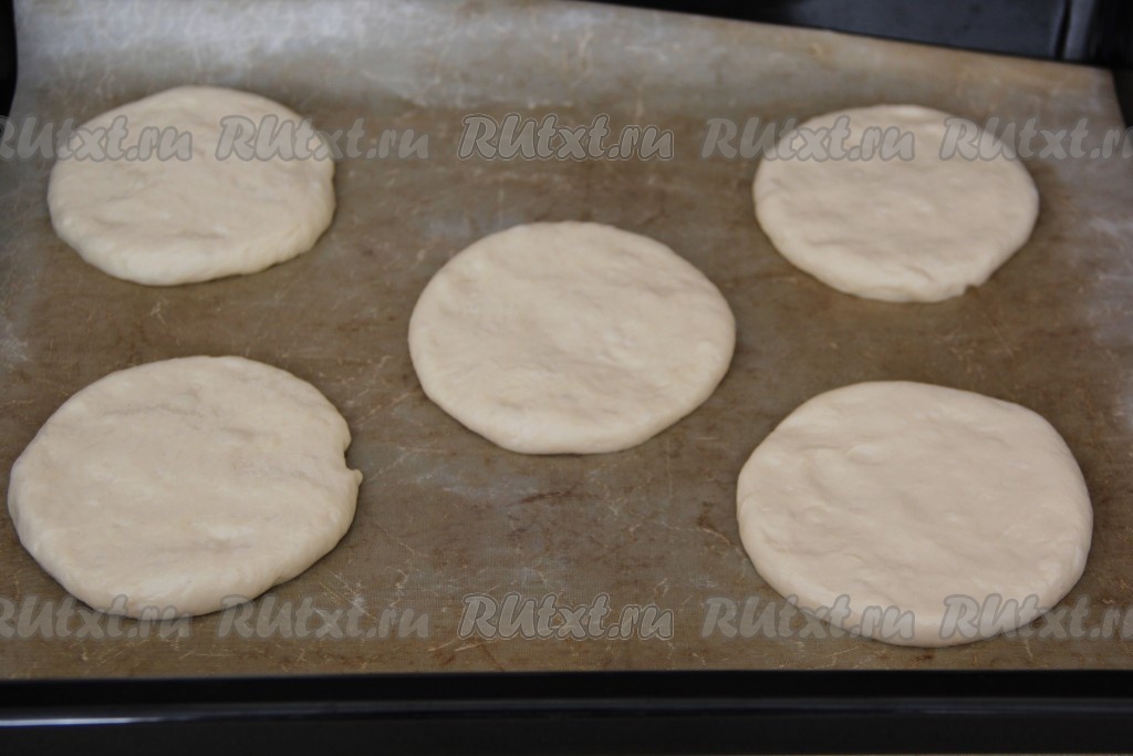 Из теста сформировать толстые лепёшки. Я просто руками, смазанными в масле, разровняла каждую часть теста в лепёшку (без использования скалки). Выложить лепёшки на расстоянии друг от друга на противень, застеленный пергаментной бумагой (или тефлоновым ковриком). Оставить лепёшки на 20 минут под полотенцем.