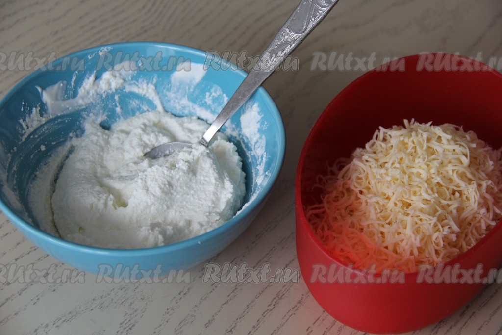 Сыр для начинки натереть на мелкой тёрке. В творог добавить сметану и пробить творожную массу до однородности погружным блендером.