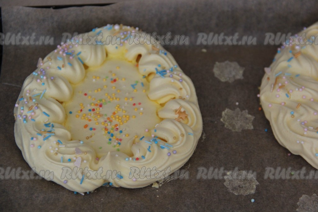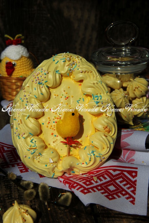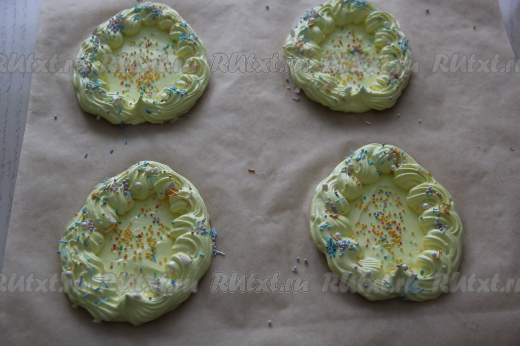Яйца из меренги посыпать цветной посыпкой. Если останется в кулинарном мешке белковая масса, её можно выложить на противень в виде небольших безешек, которые после выпечки можно использовать, например, для украшения куличей или просто съесть.