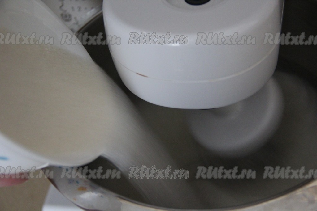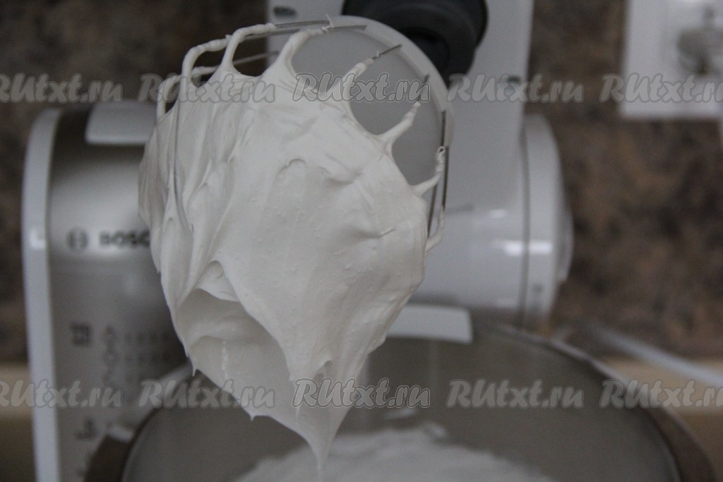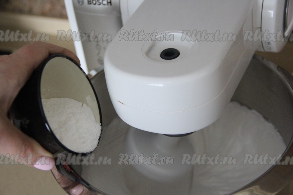 Всыпать в конце взбивания сахарную пудру и взбивать ещё, примерно, 1 минуту.