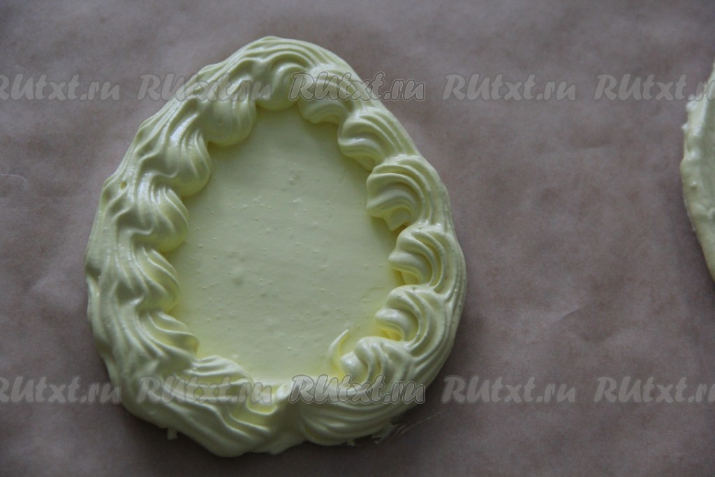 Оставшуюся часть белков выложить в кулинарный мешок с фигурной насадкой. По краю каждого пасхального яйца отсадить белки в виде рифлёной волны (как на фото).