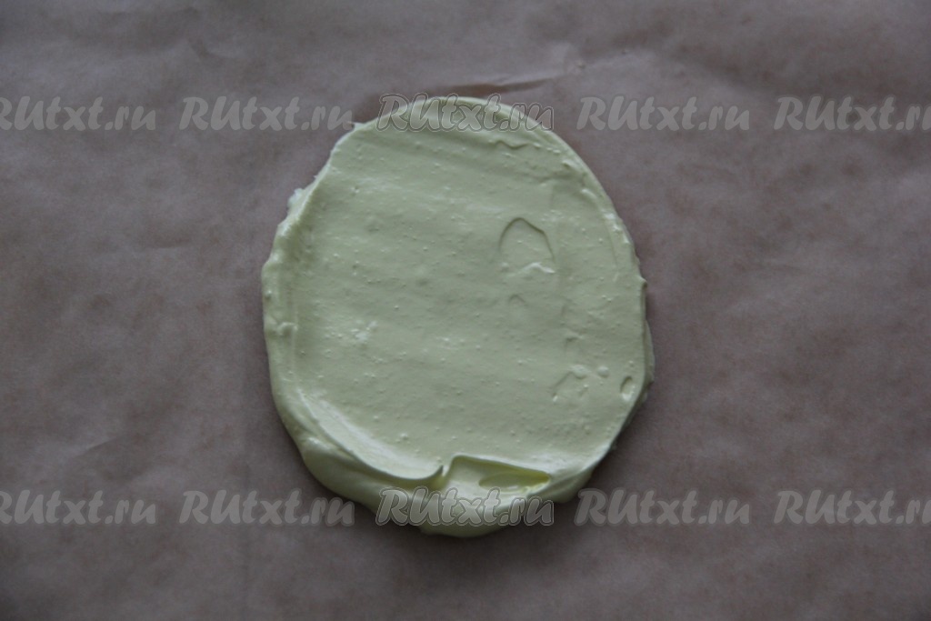 На пергаменте нарисовать овалы в виде яйца любого размера. Я делала большие украшения. Выложить часть взбитых белков на пергамент внутрь нарисованных овалов и аккуратно разровнять, не заходя за границы овалов. Таким образом сформировать все заготовки яиц. На это уйдёт, примерно, 1/3 часть всех взбитых белков.