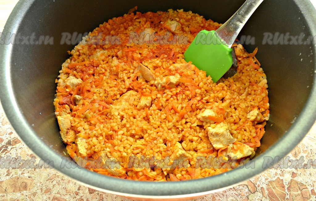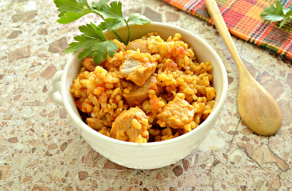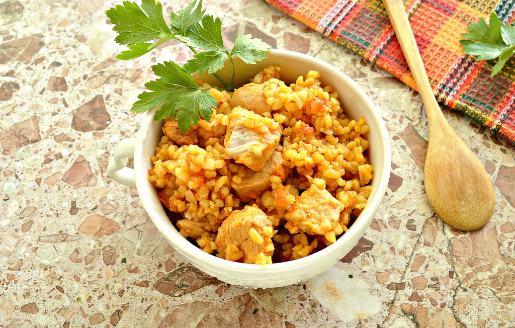 По прошествии времени рассыпчатый булгур с аппетитным, нежным куриным филе будет готов. Раскладываем вкусное, сытное блюдо из чаши мультиварки по тарелкам и сразу подаём к столу.