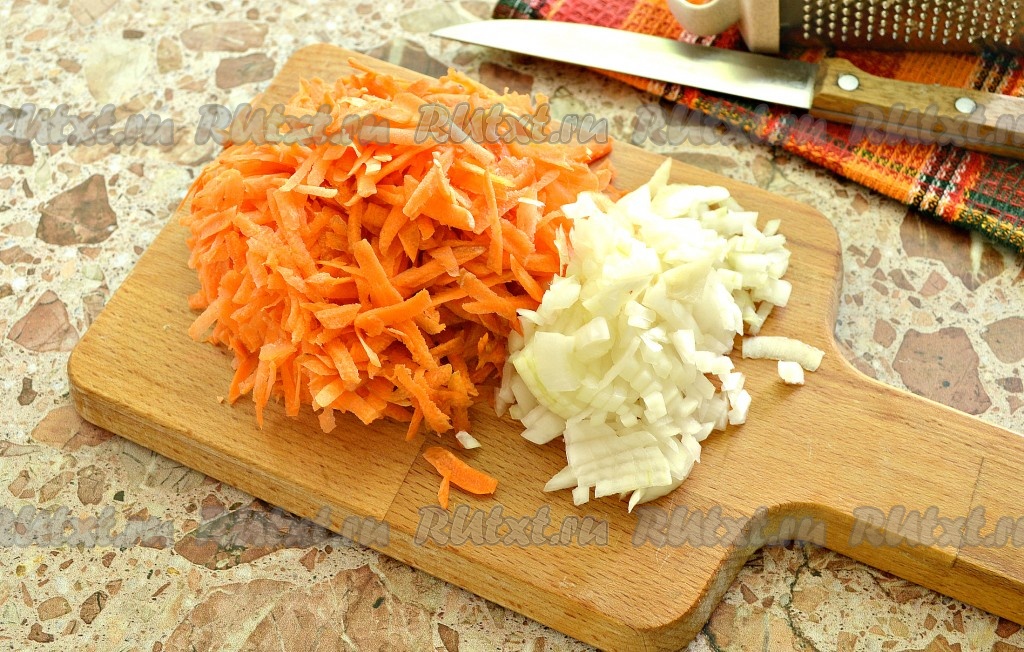 Очистить морковь и репчатый лук. В чашу мультиварки влить растительное масло. Включить программу «Жарка». Натёртую на крупной тёрке морковку и лук, нарезанный небольшими кусочками, выложить в чашу мультиварки, обжаривать, не закрывая крышку, иногда перемешивая, в течение 5 минут.