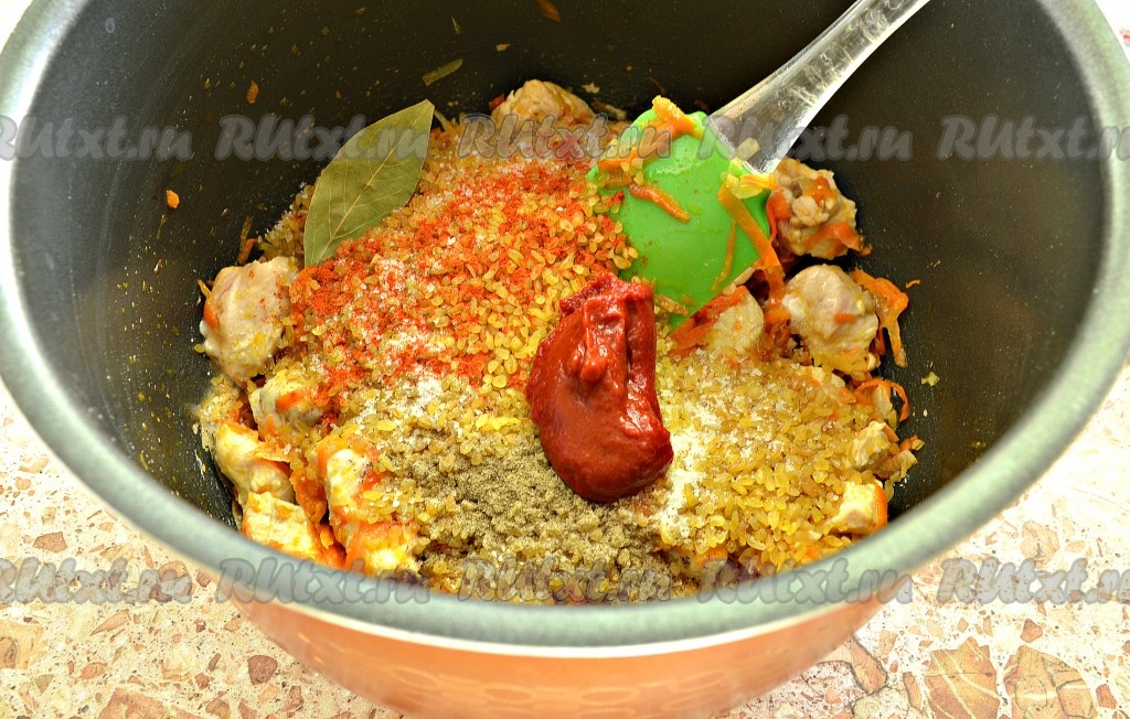 По прошествии 10 минут к куриному филе с овощами добавить булгур. Булгур не нужно предварительно промывать, ведь данная крупа, как известно, представляет собой раздробленную пшеницу, обработанную кипятком и высушенную.