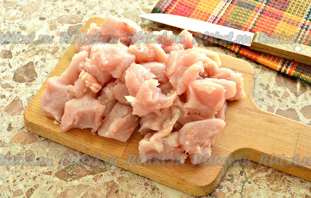 Куриное филе нарезать на кусочки шириной, примерно, 2 см, выложить в чашу к обжаренным овощам, перемешать. Кстати, вместо куриного филе можно взять другие «мясистые» части птицы - окорочка, бёдра, голени. Мясо нужно будет снять с кости, а потом уже нарезать на кусочки.