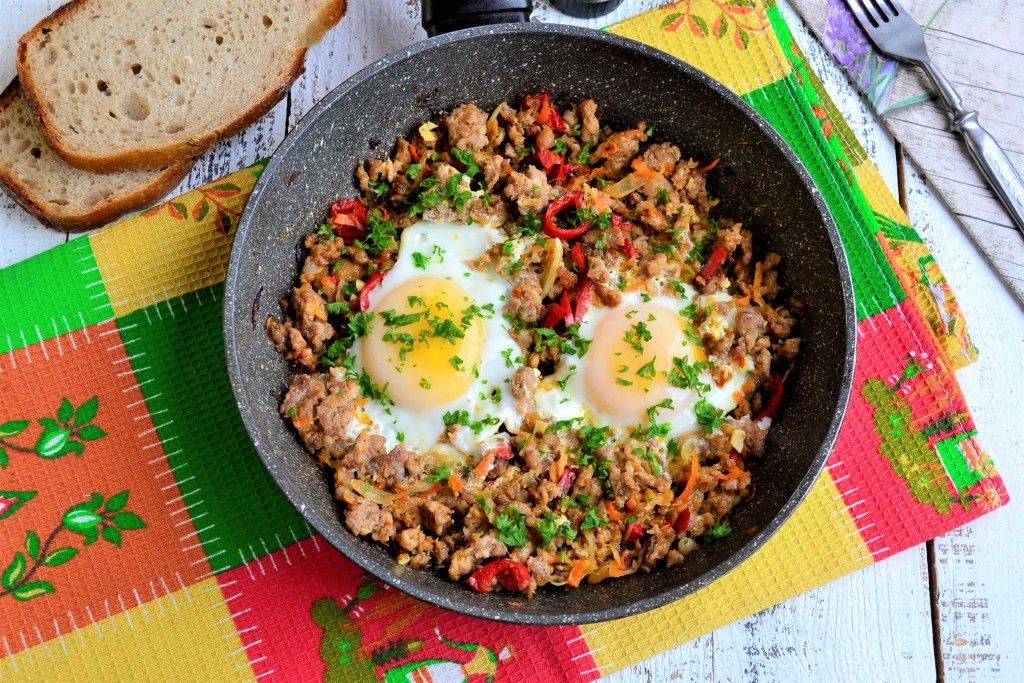 Хочу предложить вам простое, очень вкусное и сытное блюдо для завтрака или ужина - яичницу, приготовленную с фаршем. Можно использовать совершенно любой фарш (у меня - смешанный фарш из куриного филе и свинины). Я к этой яичнице подавала ещё картофельное пюре и соления, получился полноценный ужин. Рекомендую!