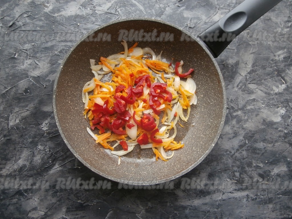 Предварительно очистить и промыть лук, половинку болгарского перца и морковь. В сковороду влить растительное масло, выложить лук, нарезанный тонкими полукольцами (или перьями), и морковку, натёртую на крупной тёрке, обжарить, иногда помешивая, до мягкости (на это потребуется, около 5 минут) на среднем огне.