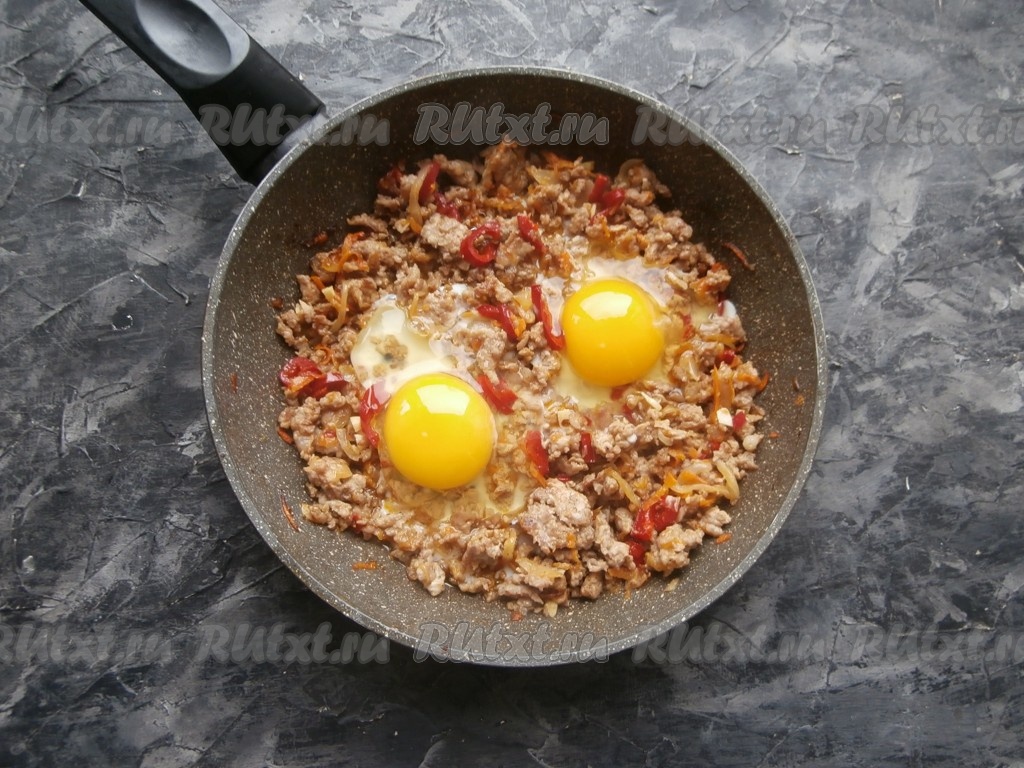 Прямо в фарш, сделав вилкой небольшие луночки, вбить сырые яйца. Чуть посолить яйца и, накрыв сковороду крышкой, на небольшом огне готовить яичницу с фаршем 4-5 минут (до тех пор, пока не свернётся белок).