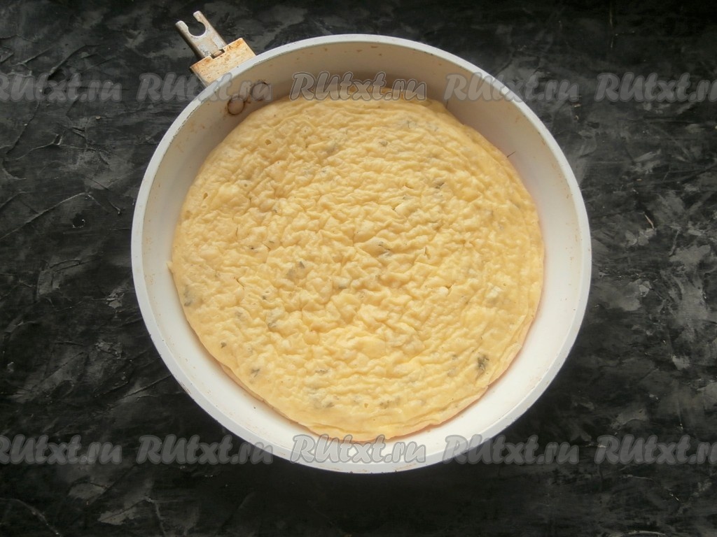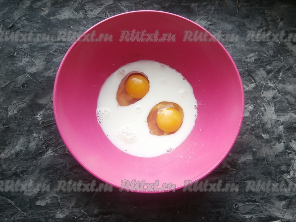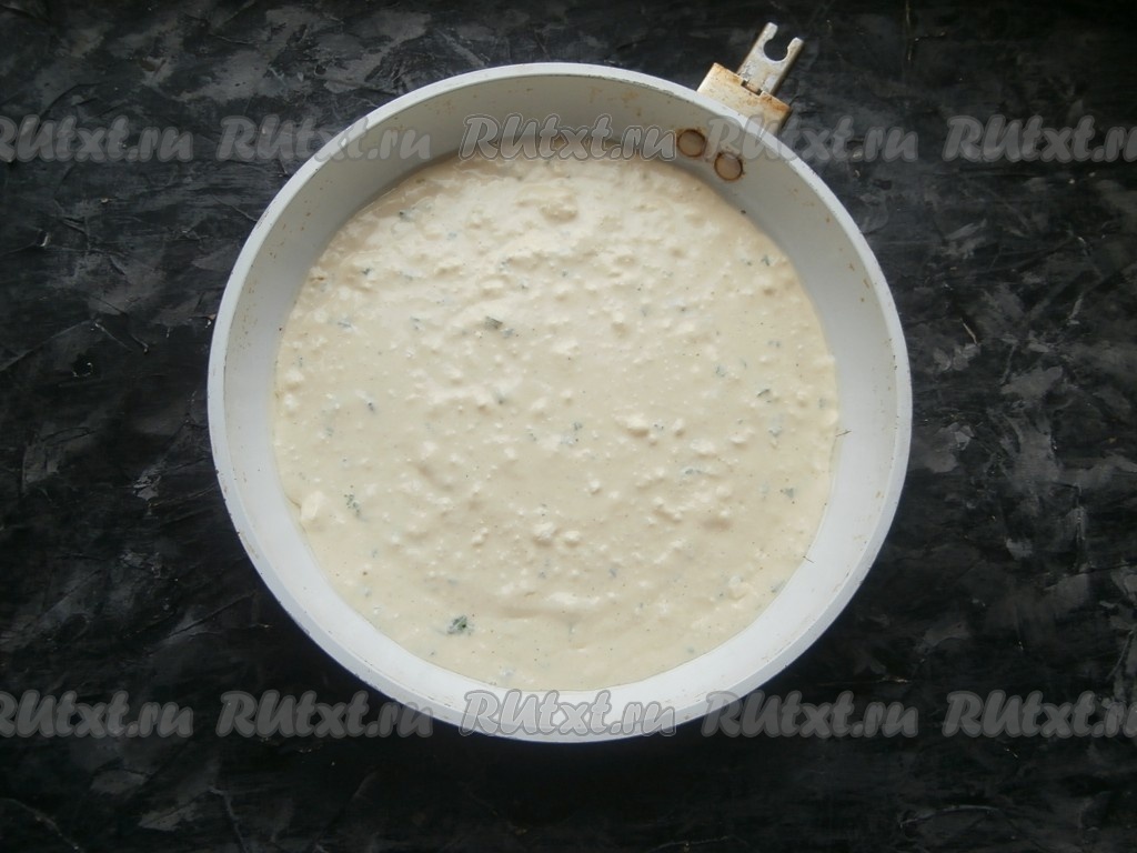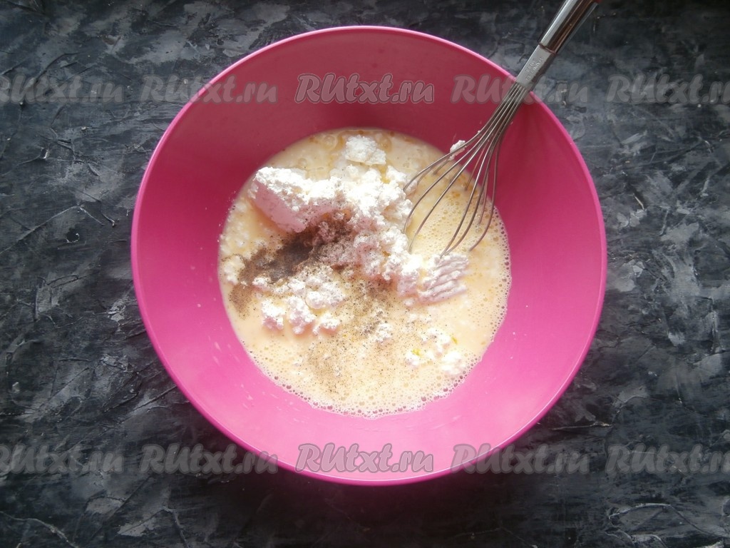 Хорошо взбить молоко с солью и яйцами венчиком, добавить чёрный молотый перец и творог.