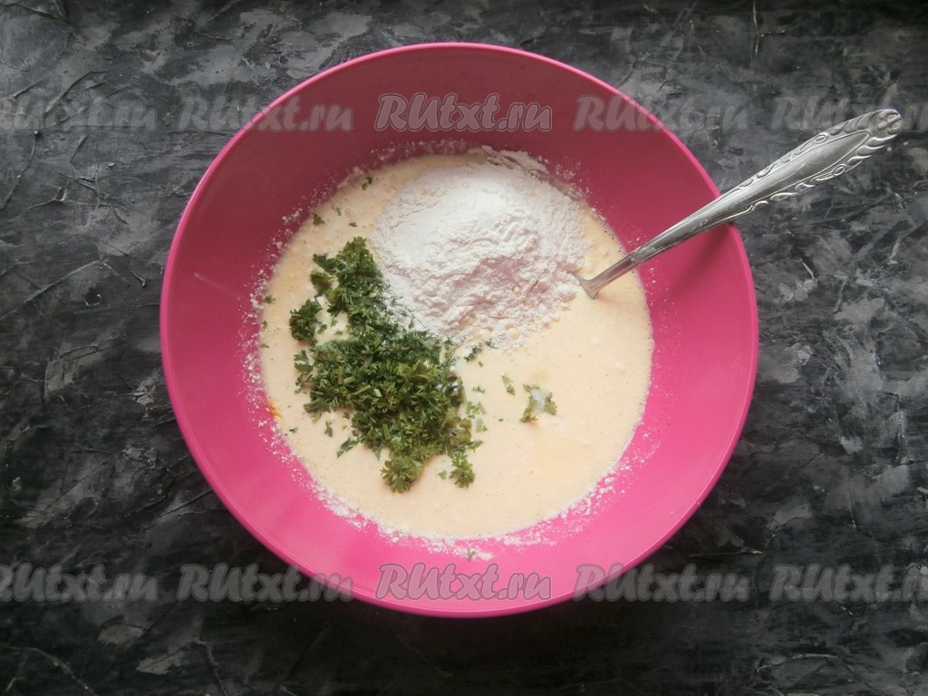 Очень хорошо перемешать получившуюся массу. Если творог мягкий, крупинки останутся мелкие, если же творог с крупными крупинками-комочками, лучше пробейте получившуюся массу погружным блендером. Далее добавить измельчённую петрушку и муку.