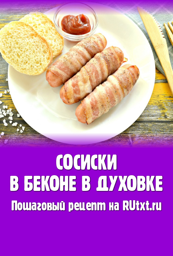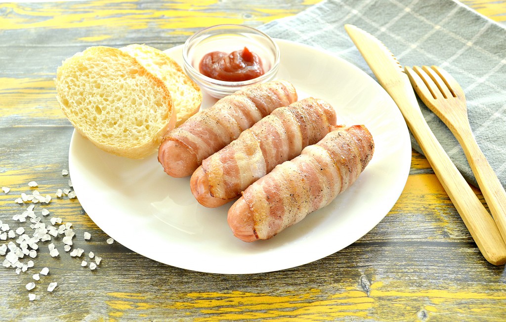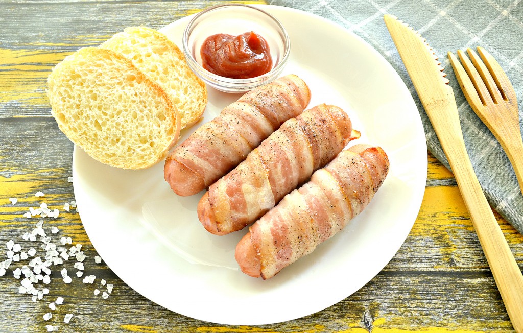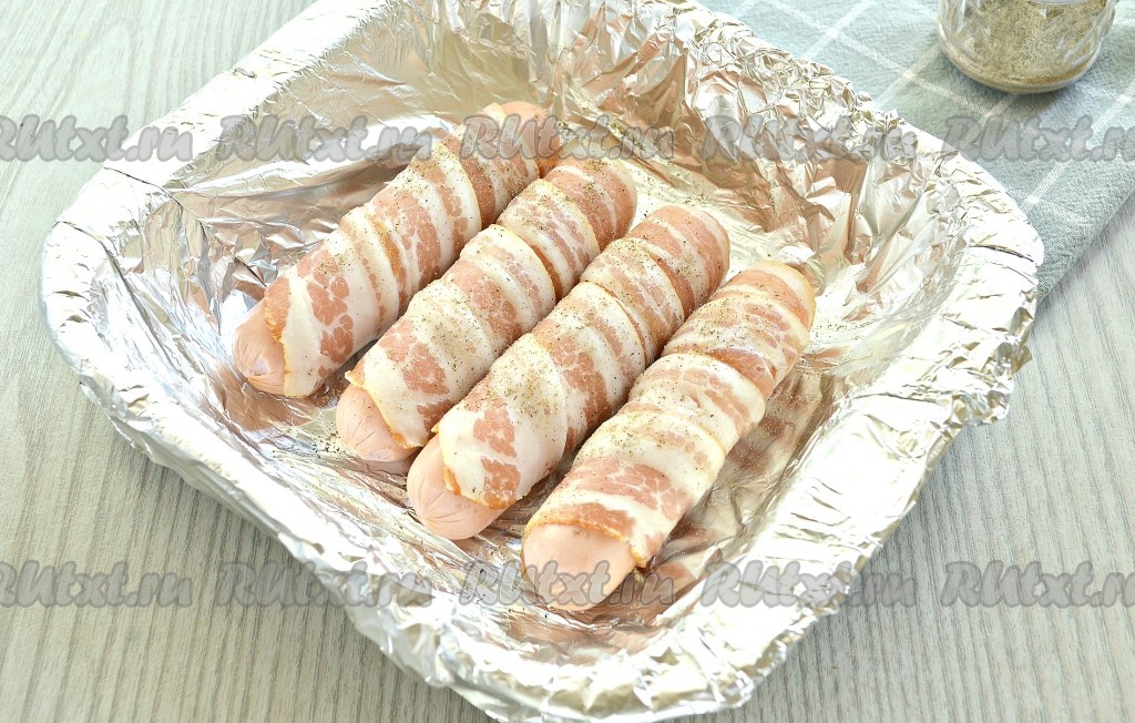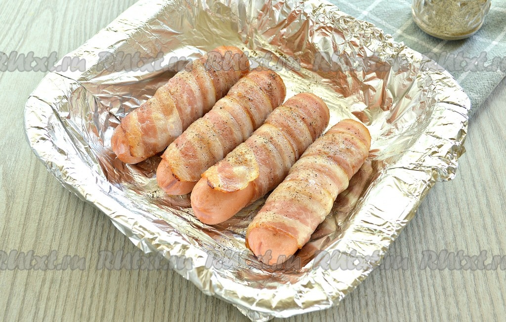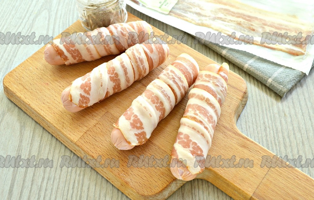 Каждую сосиску обернуть по спирали полоской бекона. Мне хватило одной полоски. Но если у вас сосиски длинные, то возьмите 2 полоски бекона.