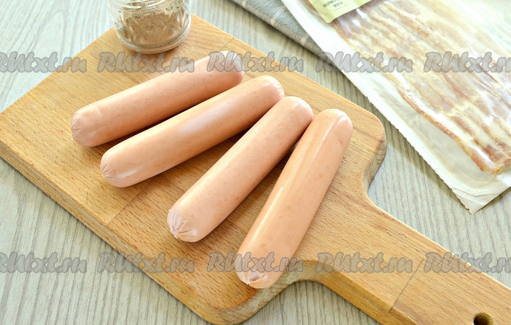 Сразу включить духовку и разогреть её до 190 градусов. Сосиски выбирайте качественные, сорт - на ваше усмотрение (я брала "Молочные"). Бекон лучше использовать уже в нарезке - полоски такого бекона тонкие, такие нам и нужны.