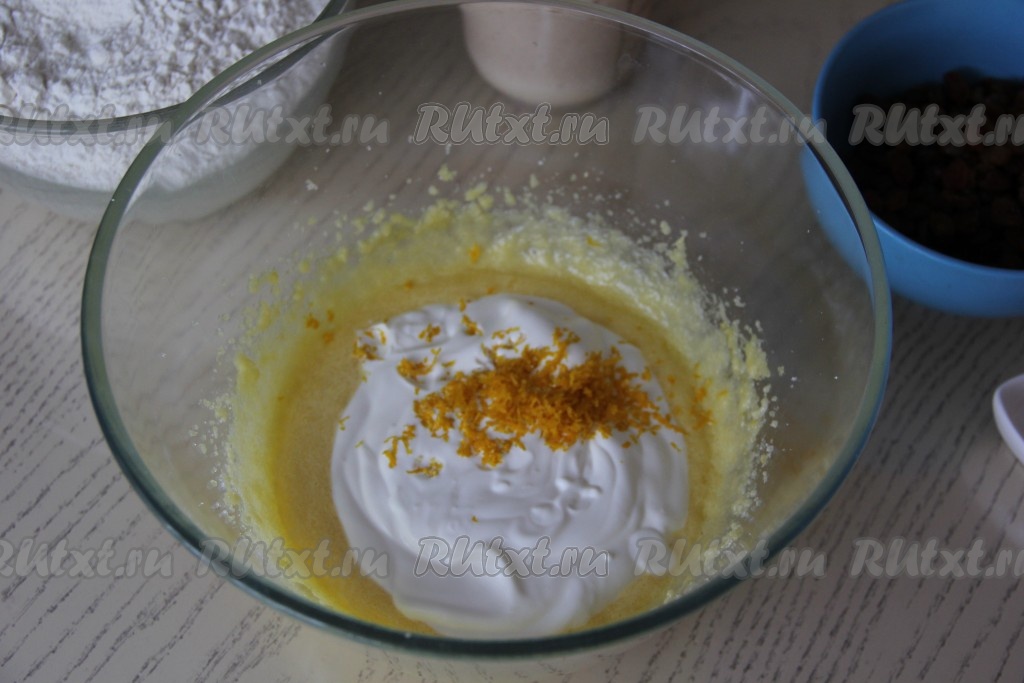С апельсина (или лимона) снять цедру. К смеси желтков и сахара добавить сметану и цедру, перемешать миксером.