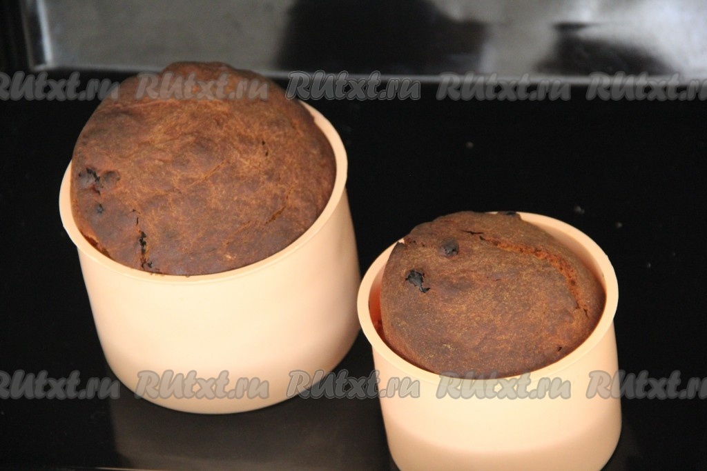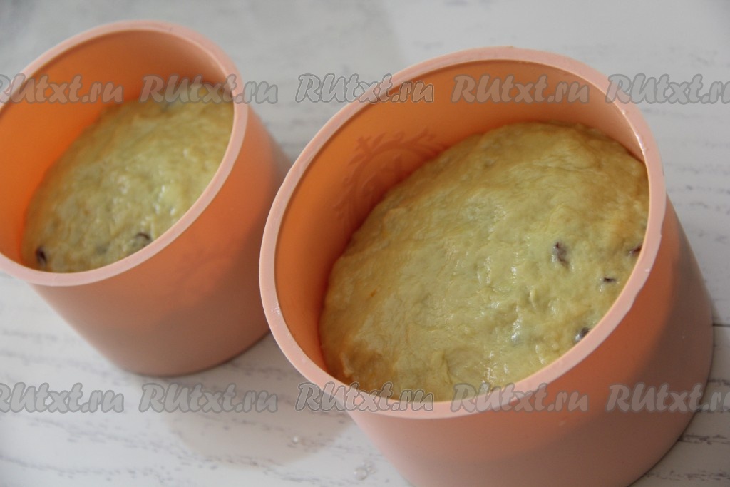 Разложить тесто по формам, заполняя их больше, чем на половину. Оставить формы в тёплом месте на 1,5 часа. Затем выпекать куличи в разогретой духовке при температуре 190 градусов, примерно, 45 минут. Время выпекания зависит от размера куличей. У меня получилось 2 кулича (один большой и один средний).